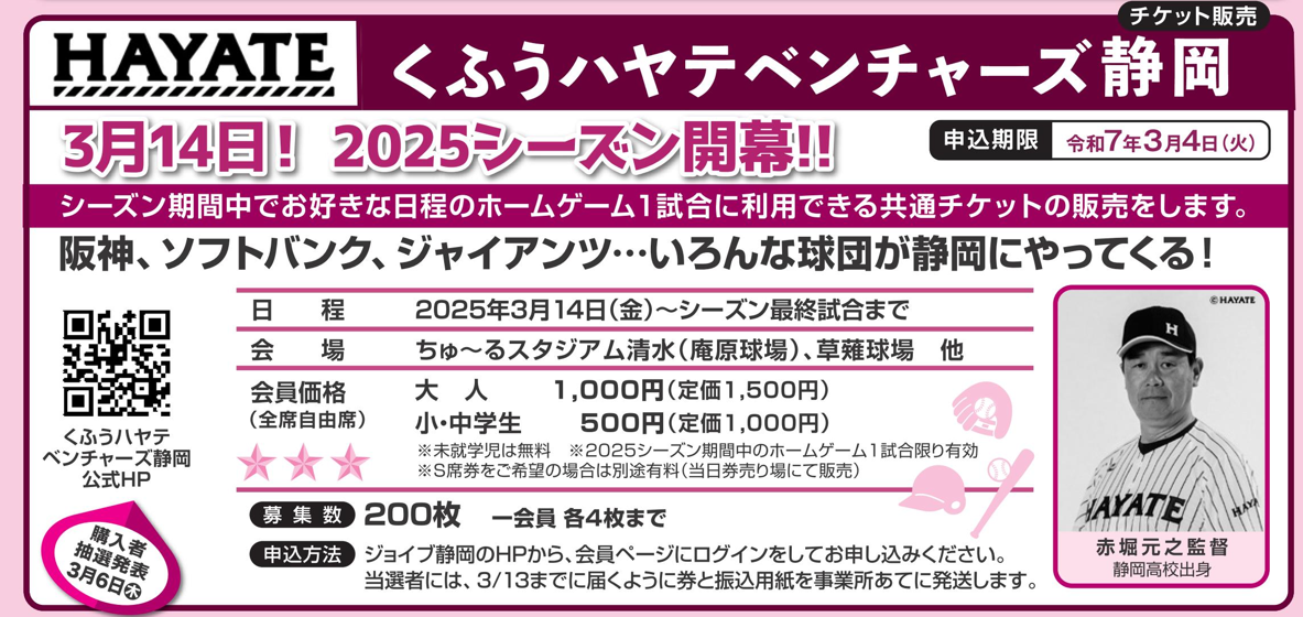 くふうハヤテベンチャーズ静岡 2025シーズン共通チケット【小・中学生券】