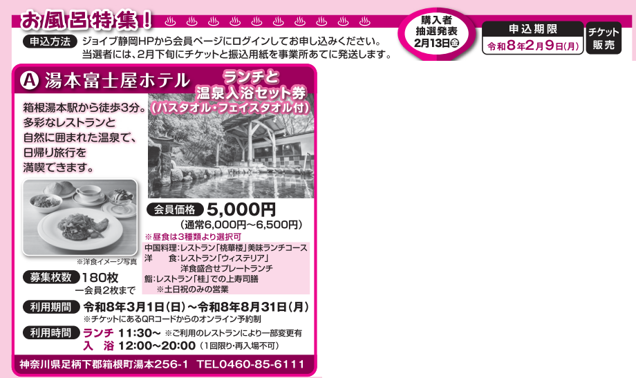 お風呂特集!A 湯本富士屋ホテル ランチと温泉入浴セット券