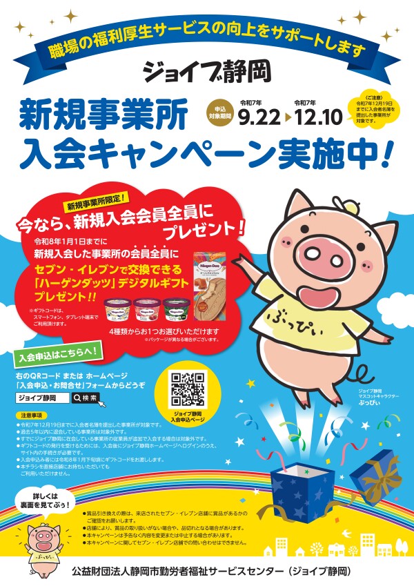 ジョイブ静岡に初めて加入する「事業所」の皆様へ、キャンペーンのお知らせです。令和7年12月10日までに、新規事業所の入会手続きを完了いただくと、入会いただいた従業員の皆様全員にセブンイレブンで交換できるハーゲンダッツアイスクリームギフトコードをプレゼントします。この機会に、楽しくお得な福利厚生を事業所に導入しませんか。福利厚生制度のご説明にお伺いもしています。お気軽にお問い合わせください。